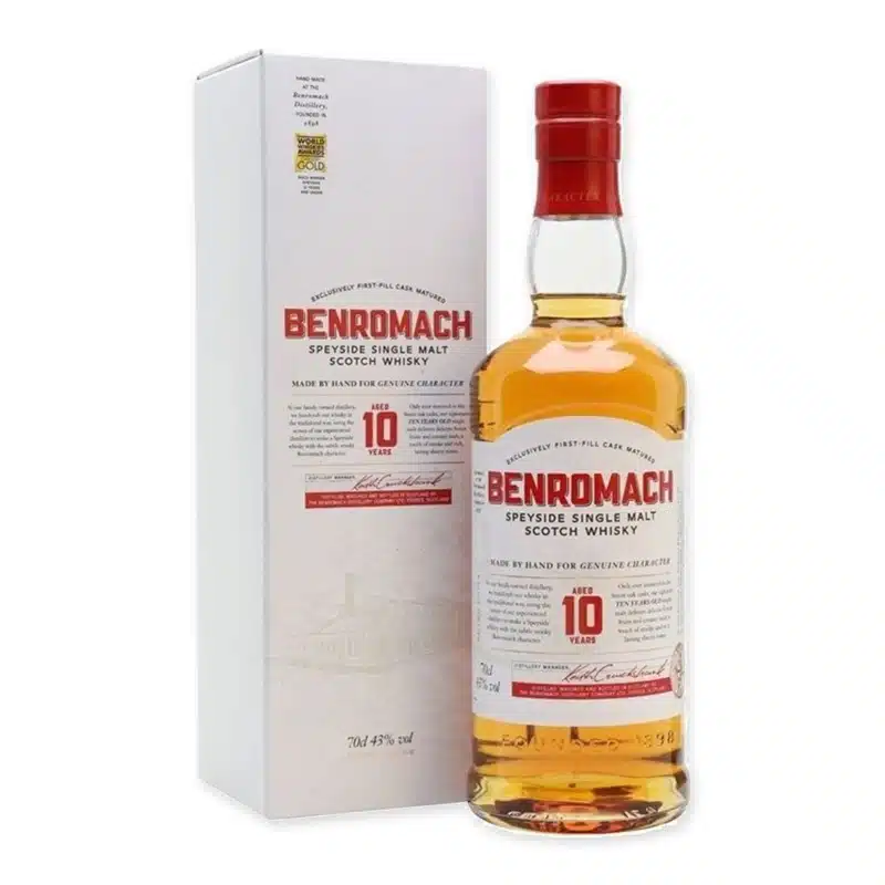Ontdek de Benromach 10 year old, een uitzonderlijke Speyside single malt met een mooie balans tussen zoete sherryinvloeden en subtiele rooktonen. Ideaal voor liefhebbers van krachtige, maar evenwichtige whisky’s.