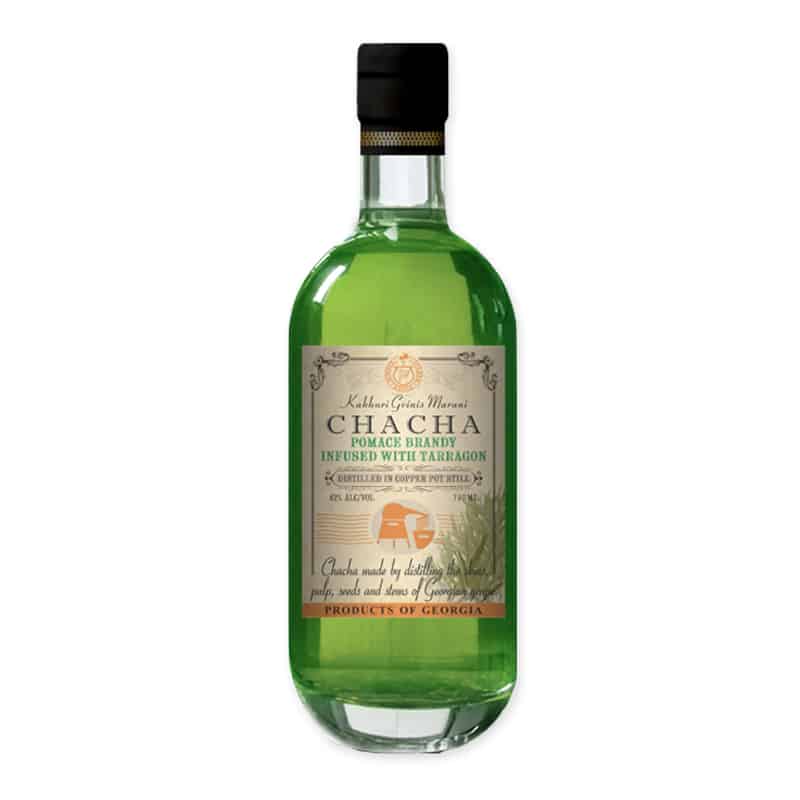 Chacha is een traditionele Georgische sterke alcoholische drank die wordt gemaakt door de schillen, pulp, zaden en stelen van druiven te distilleren volgens de oude Georgische traditionele technologie. De fijne drank heeft een sterk karakter; het is doordrenkt met lokale tarragon-bladeren die de lichte smaragdgroene kleur geven, het rijke en zoete botanische aroma zorgt voor een harmonieuze smaakervaring.