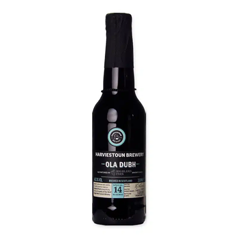 Harviestoun Ola Dubh 14 is een meesterlijk gebrouwen speciaalbier, waarbij de Schotse traditie en innovatie hand in hand gaan. Dit unieke bier ondergaat een rijpingsproces in whiskyvaten van de Highland Park Distillery, waar het zijn complexe aroma’s en texturen ontwikkelt. De naam ‘Ola Dubh’ betekent ‘zwarte olie’, wat verwijst naar de diepe, donkere kleur van het bier.