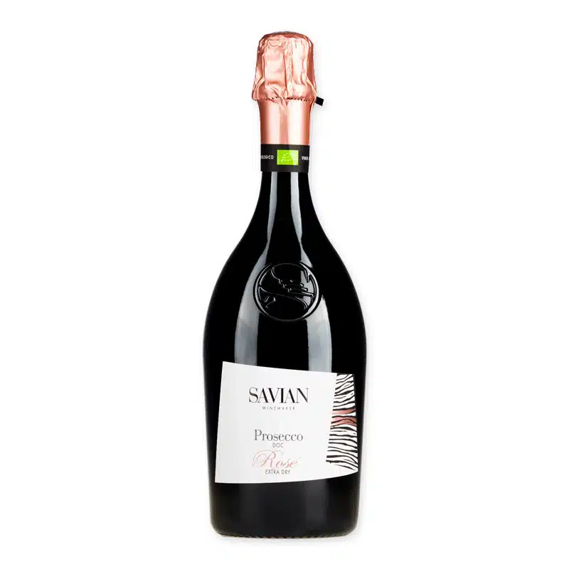 Savian Prosecco Rosato Spumante Extra Dry is een verfrissende, biologische rosé prosecco met framboos, bloemen en tropisch fruit, perfect als aperitief of bij lichte visgerechten.
