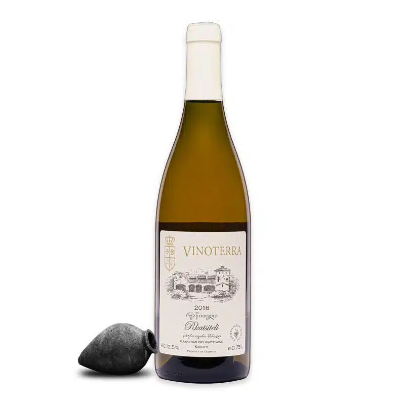 Deze mooie Vinoterra Rkatsiteliwijn is gemaakt van de gelijknamige droge witte druif, een van de oudst beschreven druiven rassen van de Georgische wijngaarden van Kakheti. De wijn wordt geproduceerd op een traditionele methode van Kakheti wat inhoudt dat het vergisten van de druiven voor de termijn van 6 maanden in een Qvevri plaatsvindt zonder toevoeging van gist. De wijn is door de methode ook niet te typeren als een gebruikelijke witte wijn, de kleur is meer amberkleurig. Deze wijn wordt gebotteld zonder filtratie.